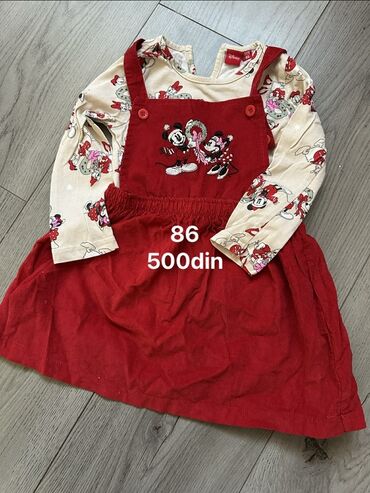 - Crvena somotska suknica-kombinezon sa tregerima i vezom Mikija i Mini
