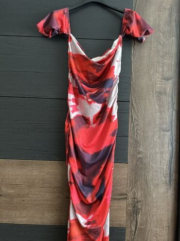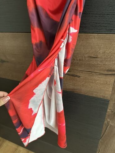 DrugoPredstavljamo žensku midi haljinu u veličini S, sa dezenom koji kombinuje crvenu, belu i ljubičastu boju. Haljina ima off-shoulder kroj sa spuštenim rukavima i karnerima, kao i kroj sa naborima koji ističe figuru. Materijal je mešavina 80% poliestera i 20% elastina, što obezbeđuje udobnost i prilagodljivost. Bočni prorez dodaje dinamičan element dizajnu. Ova haljina je pogodna za različite prilike, od dnevnih izlazaka do večernjih događaja.