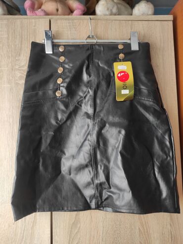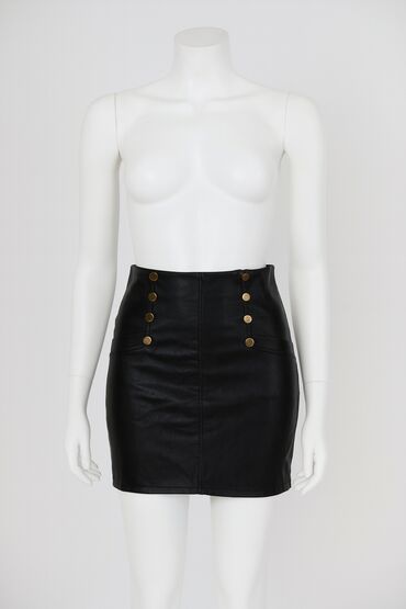 Veštačka kožaCrna mini suknja od eko kože sa visokim strukom. Uska pencil silueta, dužina iznad kolena. Napred dekorativni nizovi metalnih dugmića u zlatnoj boji (po pet sa svake strane). Dva ukrasna šava/džepa sprijeda, centralni šav i skriveni rajsferšlus pozadi. Glatka, blago sjajna površina.