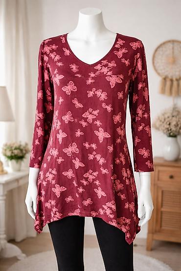 - Detalji: fino obrubljen V izrez, celoprekriveni motiv leptira koji daje ženstven i razigran izgled
