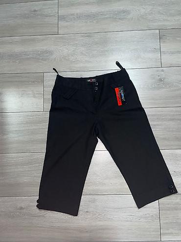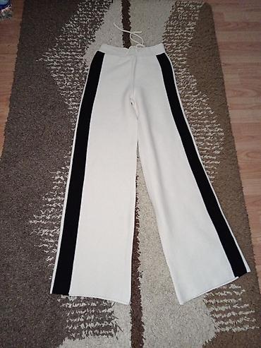 - Sportsko–ležerne ženske pantalone u beloj boji sa crnim bočnim prugama duž cele nogavice. Široke nogavice, elastičan pojas sa učkurom za podešavanje. Meki, pleteni/žersej materijal prijatan za nošenje. Odlične za svakodnevne kombinacije i udoban casual stil.