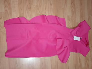 - Elegantna haljina u jarko roze boji, kroj olovka do ispod kolena. Asimetričan gornji deo bez rukava sa izraženim karnerom koji prelazi preko struka i spušta se niz bok, stvarajući efekat pepluma. Struk naglašen, suknja ravna sa ukrasnim naborima sa strane. Pogodna za svečane prilike i večernje izlaske. Materijal srednje debljine sa blagim padom.