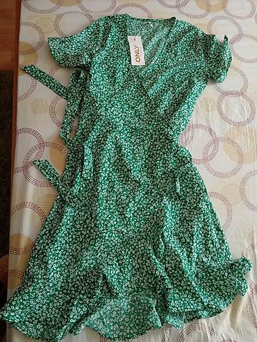 - Zelena wrap/preklope haljina sa belim sitnim cvetnim printom (brend ONLY). V-izrez, kratki rukavi, vezivanje u struku pomoću dužih traka sa obe strane, što omogućava prilagođavanje obimu. Donji rub talasast sa laganim volanima, dužina do kolena ili malo ispod u zavisnosti od visine. Lagan, prozračan materijal idealan za proleće i leto.
