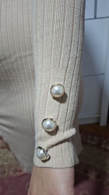 Mekani konac midi haljina sa dugim rukavima i rol-kragnom, u bež boji. Uski, rastegljivi kroj prati liniju tela, sa diskretnim prorezom sa strane. Rukavi ukrašeni dekorativnim dugmadima u vidu bisera sa zlatnim obrubom.