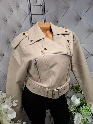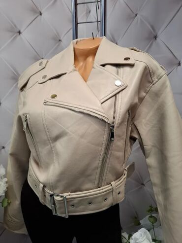 Ženska biker jakna u krem/bež boji - Materijal: glatka eko koža sa blagim mat sjajem - Kroj: kratka, strukturisana silueta sa naglašenim ramenima - Revers kragna sa metalnim drukerima - Asimetričn...