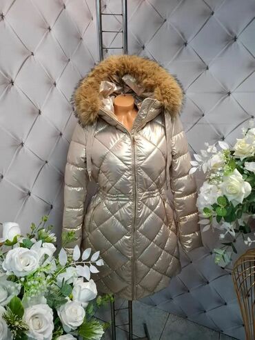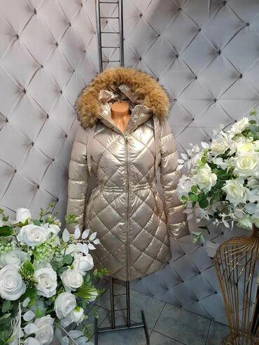 Zimska ženska jakna sa kapuljačom i krznom Ik - Model: duža puffer jakna, strukirana silueta - Boja: šampanj/zlatna, sa blagim sjajem - Šavovi: dijagonalno prošivanje (romboidni dezen) za bolju top...