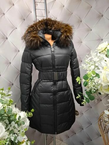 Duga ženska zimska jakna/puffer kaput, crne boje, sa kapuljačom ukrašenom bogatim krznom u prirodnoj bež nijansi. Topla, prošivena konstrukcija sa horizontalnim štepovima pruža odličnu termoizolaci...