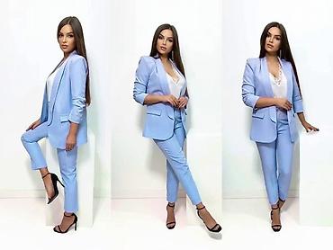 Dvodijelni ženski komplet – svetloplave boje - Gornji deo: skraćeni sako sa reverima, jednoredno kopčanje jednim crnim dugmetom, lagana postava u istoj nijansi, dekorativni džepić na grudima. Na m...