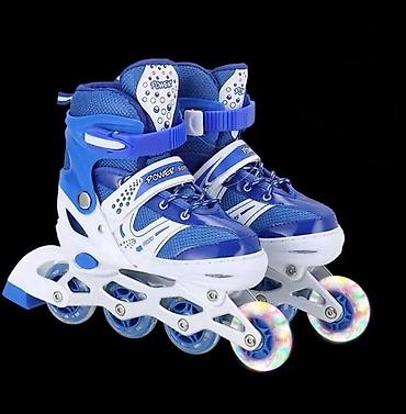 Roleri na 4 točka (in-line), plavo‑beli - Tip: podesivi roleri sa 4 točka u nizu - Sistem zatvaranja: kombinacija pertli, čičak trake i mikro‑kopče za sigurno fiksiranje zgloba - Konstrukcija: tvr...