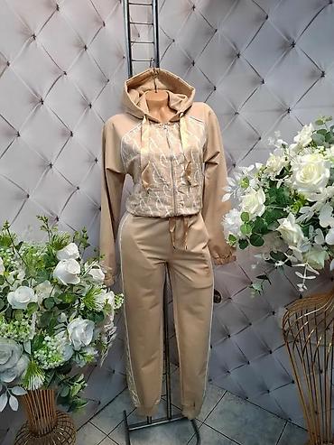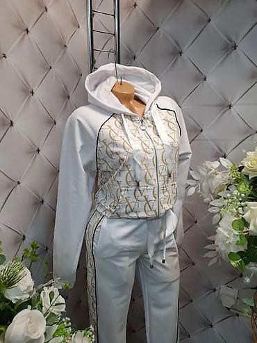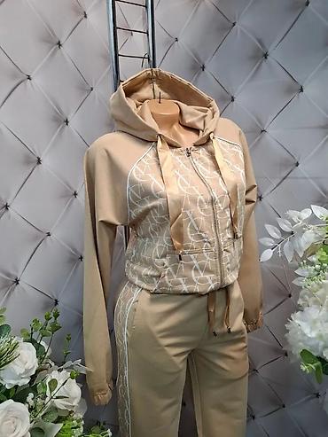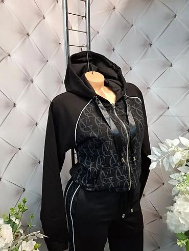 Ženski komplet trenerke sa kapuljačom – gornji deo + donji deo. - Model: duks na rajsferšlus sa kapuljačom i širokim učkurima; donji deo sa elastičnim pojasom i učkurom, manžetne na nogavicama. - ...