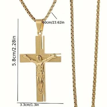Zlatna muška ogrlica sa krstom – privjesak Raspeće - Materijal: zlatno-tonirani nerđajući čelik (sjajna završna obrada) - Dizajn: trodimenzionalna figura Raspeća na krstu sa graviranim detaljima; ...