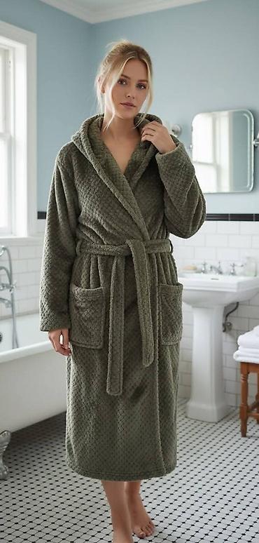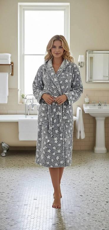 Extreme Intimo kućni bade-mantil sa kapuljačom - Model: sivi, pahuljast/fleecasti materijal, izuzetno mek i topao - Brend: extreme intimo - Veličina: 36–38 (označeno na etiketi) - Dizajn: kapuljač...