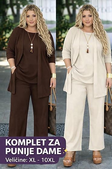 Damski komplet – sako i šorts u istom materijalu i boji. - Boja: topla braon/karamel, diskretan „herringbone” dezen. - Sako: dvoredno kopčanje sa četiri tamna dugmeta, reveri klasičnog kroja, dva ...