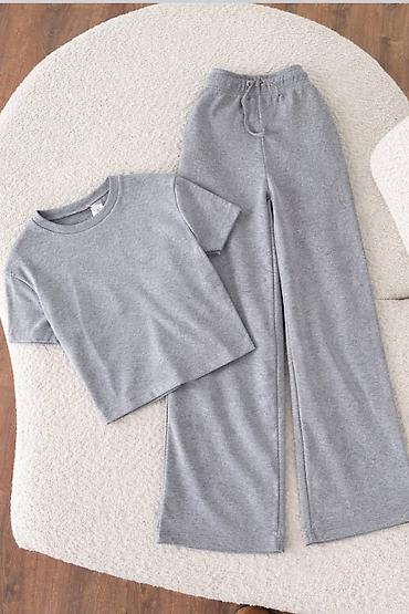 Komplet u boji bordo: majica + široke pantalone sa pojasom - Majica kratkih rukava, okrugao izrez, tonalni print/reljefni natpis napred. - Pantalone visokog struka, široke nogavice (palazzo kroj) ...