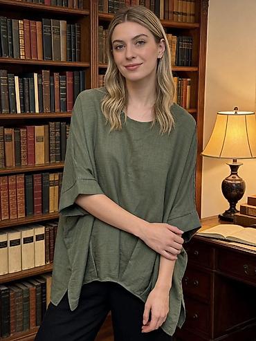 Ženska bluzica od laganog, poluprozirnog šifona, lepršavog kroja. Okrugli izrez sa crnim porubom, kratki široki rukavi sa blagim faltnama koje daju voluminozan, talasast efekat. Bogat etno/paiseley...