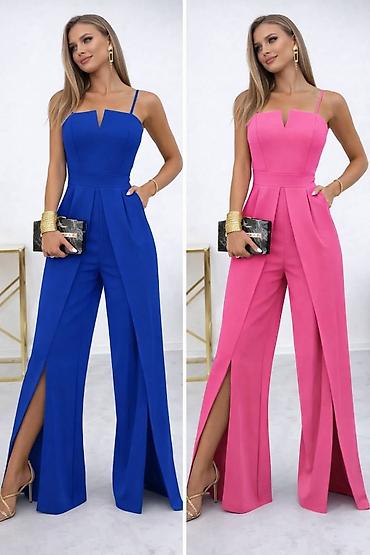 Elegantni ženski kombinezon sa asimetričnim gornjim delom - Model: pantalone sa visokim strukom i ravnim, širokim nogavicama - Gornji deo: uska korset silueta sa tankim bretelama; asimetrični prekl...