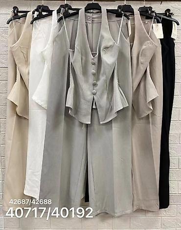 Dvodijelni ženski komplet – svetloplave boje - Gornji deo: skraćeni sako sa reverima, jednoredno kopčanje jednim crnim dugmetom, lagana postava u istoj nijansi, dekorativni džepić na grudima. Na m...