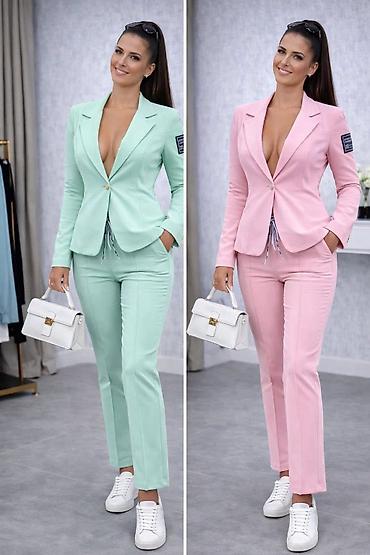 • Dvodijelni komplet u boji svijetloružičaste: kratki sako i mini suknja