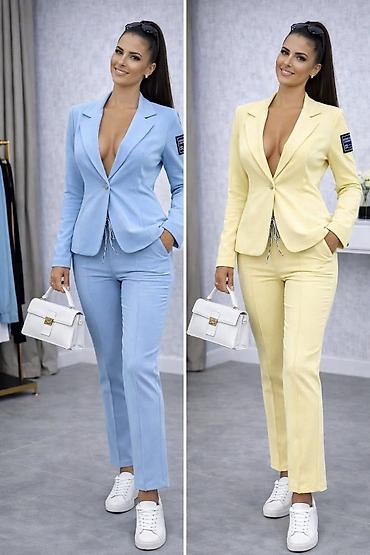 Dvodijelni ženski komplet – svetloplave boje - Gornji deo: skraćeni sako sa reverima, jednoredno kopčanje jednim crnim dugmetom, lagana postava u istoj nijansi, dekorativni džepić na grudima. Na m...