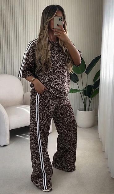 Ženski komplet – široke pantalone + kratka majica - Dvodijelni set sastavljen od kratke majice ravnog kroja i pantalona sa širokim nogavicama. - Elastičan pojas na pantalonama za udobno pristajanj...