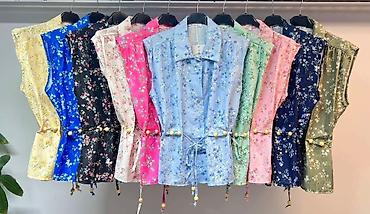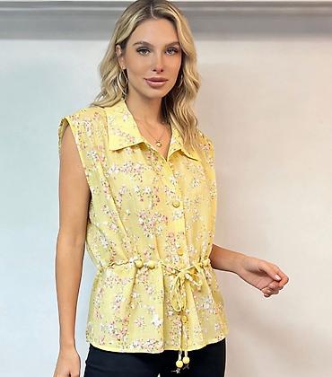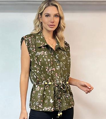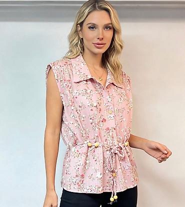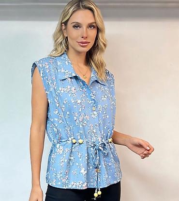 Ženske letnje košulje bez rukava sa cvetnim printom Gs - Model: lagana košulja sa kragnom i dugmadima sprijeda - Kroj: opušten, sa čvorom/vezivanjem napred za stilizovan struk - Detalji: nežni cvet...