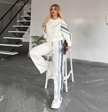Dvodelni ženski komplet – bluza kratkih rukava i pantalone širokih nogavica. - Model: sportsko-elegantan komplet sa kontrastnim belim prugama na rukavima i pojasu. - Bluza: kratki rukav, V-izrez s...