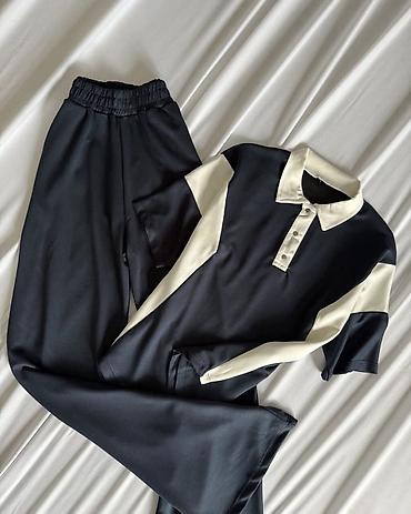 Damski komplet – majica i široke pantalone - Model: dvoslojni komplet od mekane, elastične trikotaže - Gornji deo: kratki rukavi sa dekorativnim prošivima u više linija, okrugli izrez - Donji deo:...