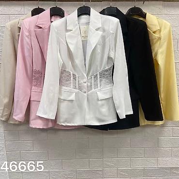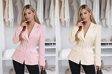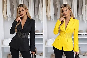 Ženski sako tamnoplave boje sa crvenim paspulom i detaljima u vidu mašni. Klasičan kroj sa lagano strukiranom siluetom. Prednji deo sa tri dugmeta u toniranoj crvenoj boji. Rever je zaobljen, obrub...