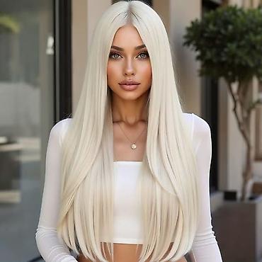 Duga perika u platinasto beloj nijansi – talasasta, prirodnog izgleda - Boja: platinasto bela, hladni tonovi, visok sjaj - Dužina: extra duga, doseže ispod grudi - Tekstura: mekani, široki talasi ...
