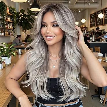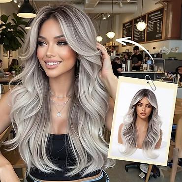 Perika – ravni lob sa šiškama, sivi “ombre” efekt - Stil: srednja dužina (oko 14 inča/35,5 cm), ravan lob sa punim šiškama. - Boja: hladni sivi ombre – tamniji koren postepeno prelazi u svetlosreb...