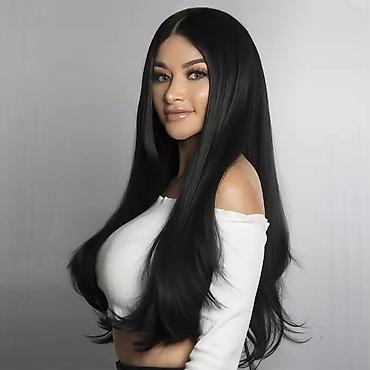 Perika sa šiškama – duga talasasta crna - Stil: duga, talasasta kosa sa ravnim šiškama - Boja: intenzivno crna - Dužina: do ispod grudi (otprilike 60–70 cm) - Tekstura: mekani, definisani talasi s...
