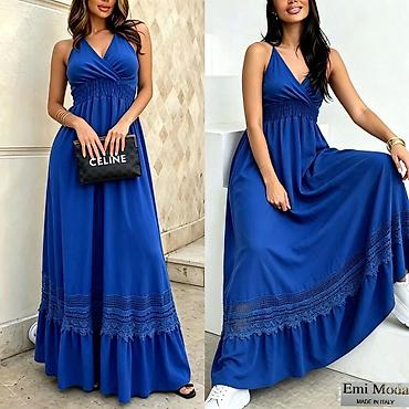 Dugačka ženska haljina svetloplave boje, bez rukava, sa okruglim izrezom. Karakteriše je rajsferšlus na dekolteu, kao i slojeviti dizajn sa naborima koji dodaju volumen i lepršavost. Idealna za sva...