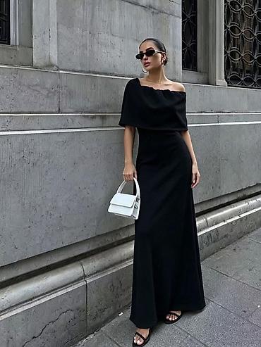 Crna haljina sa dubokim dekolteom. Duzina i sirina na slikama