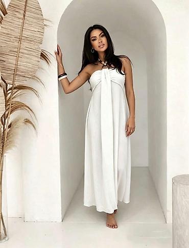 Bela uzana midi haljina bez rukava, sa topom sa naborima i ukrštenim bretelama. Haljina ima dubok dekolte i ukrasne trake oko struka. Dužina haljine doseže do kolena, sa prorezom pozadi za lakše kr...