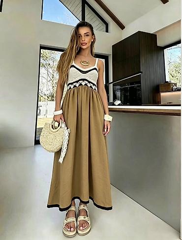 Ženska maksi haljina bez rukava u toploj nijansi smeđe boje. Karakteriše je slojevit dizajn sa naglašenim naborima, što joj daje lepršav i udoban kroj. Idealna je za svakodnevno nošenje, opuštene p...