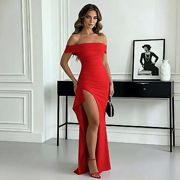 Elegantna večernja haljina – model sa spuštenim ramenima - Kroj: uska silueta koja prati liniju tela, duga dužina - Gornji deo: spuštena ramena (off-shoulder) sa glatkim, elastičnim pojasom oko de...