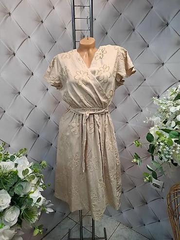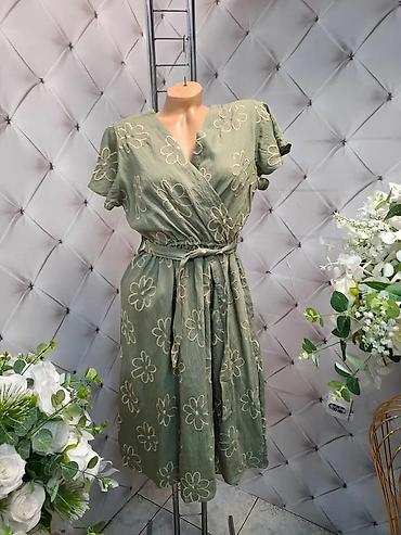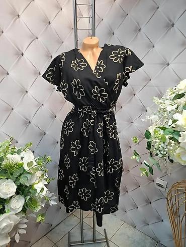 Letnja haljina u aqua nijansi sa cvetnim printom. - Kroj: midi dužina, A-linija sa stepenastim (tiered) volanima. - Gornji deo: okrugao izrez, blago spuštena ramena sa efektnim naboranim rukavima...