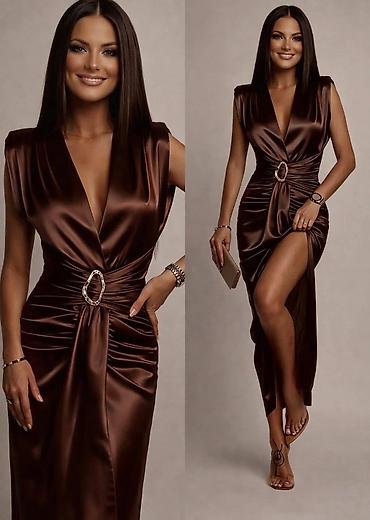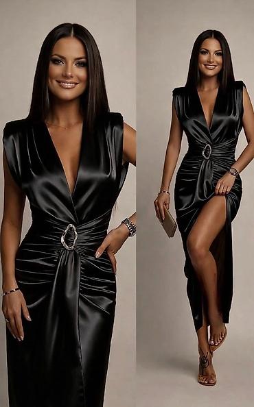 Elegantna večernja haljina od satenskog materijala - Model: midi/maksi kroj sa dubokim V izrezom - Materijal: glatki, sjajni saten koji lepo pada i prati liniju tela - Dizajn: visoki šlic sa stran...