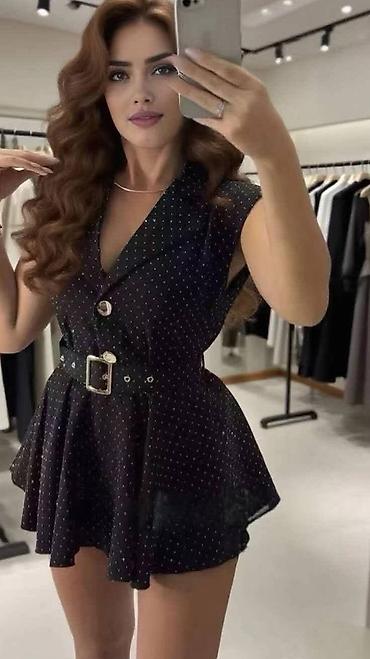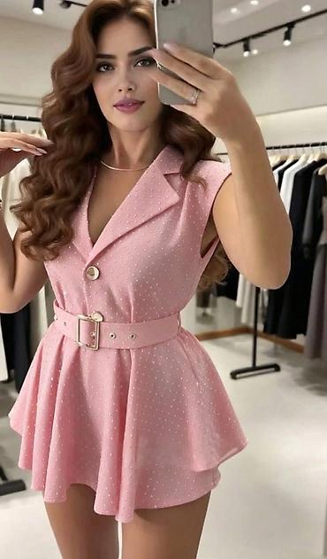 Ljubičasta mini/kratka haljina sa kratkim rukavima i raširenim A-krojem. Model ima duboki, zaobljen dekolte sa malim V-izrezom po sredini i formiranim šavovima preko grudi koji naglašavaju oblik. T...