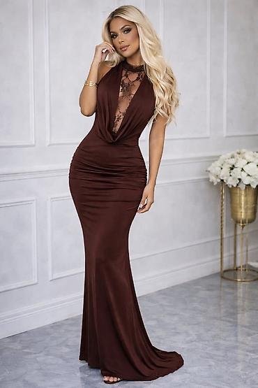 Elegantna svečana haljina sa korsetskim gornjim delom ukrašenim čipkom i sitnim šljokicama. Uska silueta do poda od glatke, satenske tkanine lepo prati liniju tela. Sa bočne strane nalazi se kaskad...