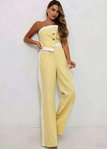 Elegantni ženski kombinezon bez bretela - Model: strapless kombinezon sa širokim nogavicama - Kroj: gornji deo asimetričan, preklop sprijeda; naglašena struk-linija - Detalji: četiri dekorativna r...