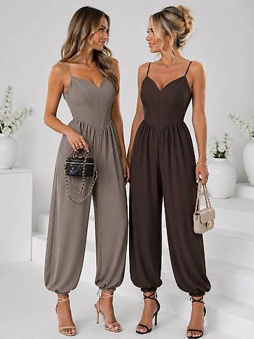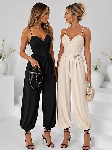 Elegantni ženski kombinezon sa širokim nogavicama i prorezima sa strane. Gornji deo je korset kroja sa tankim bretelama i diskretnim V‑izrezom na sredini, koji lepo naglašava dekolte. Struk je suže...