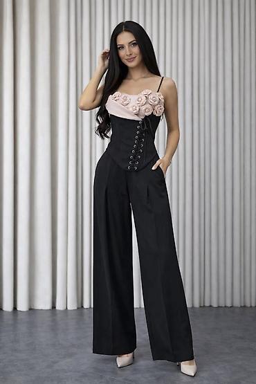 Ženski komplet – prsluk bez rukava i široke pantalone - Kroj: dvoredni prsluk bez rukava sa dubokim reverima, struk naglašen blago strukiranim krojem; pantalone sa visokim strukom i ravnim, široki...
