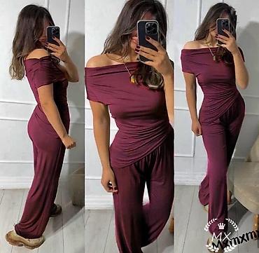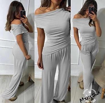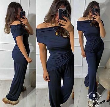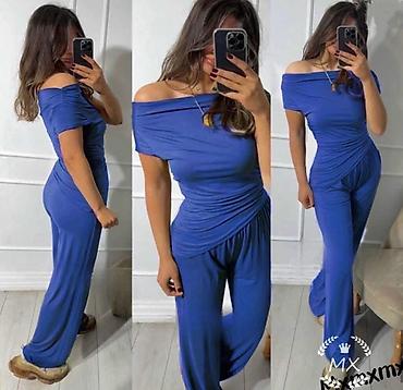 Komplet široke pantalone visokog struka na lastiz i bocnim dzepovima sa ravim stepom po sredini nogavica i majica siroka kratkih rukava do lakta. Duže nogavice 120cm. Pamuk kvalitetan sa elastinom....