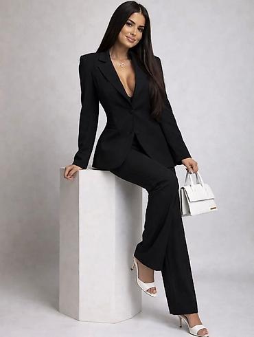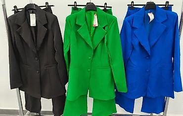 Damski komplet – sako i pantalone - Moderan dvodelni komplet u više boja: bež, crna, roze i svetloplava. - Strukirani sako sa jednim dugmetom, reverima i diskretnim bedžem/etiketom na rukavu. - Pa...
