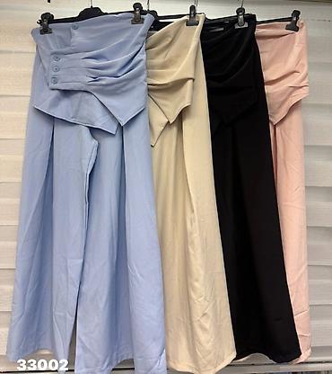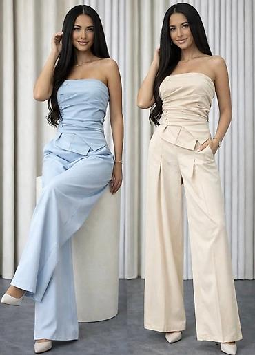 Dvodijelni ženski komplet – svetloplave boje - Gornji deo: skraćeni sako sa reverima, jednoredno kopčanje jednim crnim dugmetom, lagana postava u istoj nijansi, dekorativni džepić na grudima. Na m...