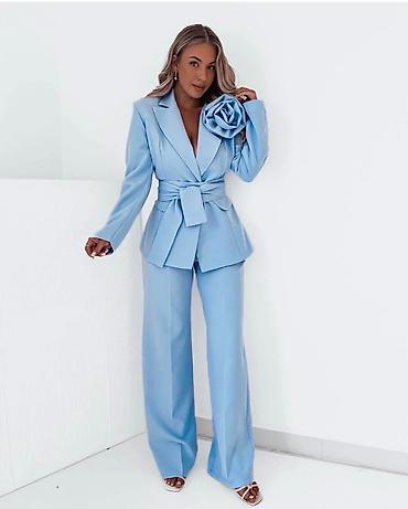 Dvodijelni ženski komplet – svetloplave boje - Gornji deo: skraćeni sako sa reverima, jednoredno kopčanje jednim crnim dugmetom, lagana postava u istoj nijansi, dekorativni džepić na grudima. Na m...