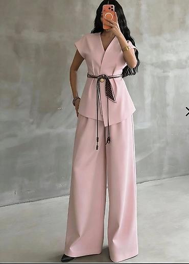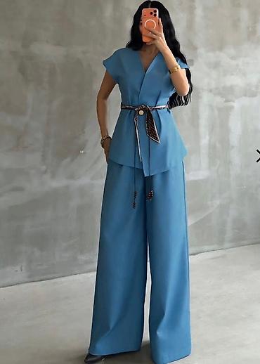 Ženski komplet – bluza i pantalone širokog kroja - Dizajn: ležeran i elegantan dvodelni komplet. Gornji deo je asimetrična, lagano prebacena bluza koja se može nositi preko jednog ramena. Pantalon...