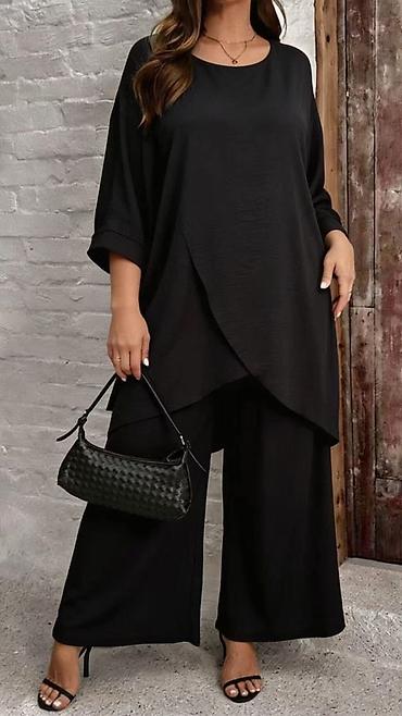 Damski komplet:tunika širokog kroja i pantalone širokih nogavica. - Lagani saten prijatan na koži i lepršav. - Kroj bluze pončo/kimono stil, široki rukavi,opušten silueta, okrugao izrez. - Pantalon...
