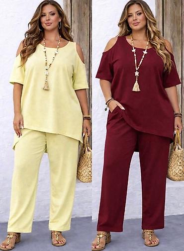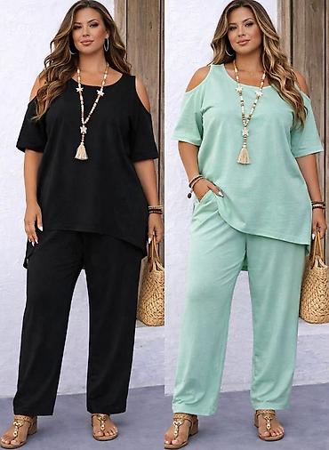 Elegantni ženski komplet – tunika bez rukava + široke pantalone - Kroj: tunika sa V-izrezom i preklopom, blago asimetričnog peplum efekta; pantalone ravnog, vrlo širokog („palazzo“) kroja za leprš...